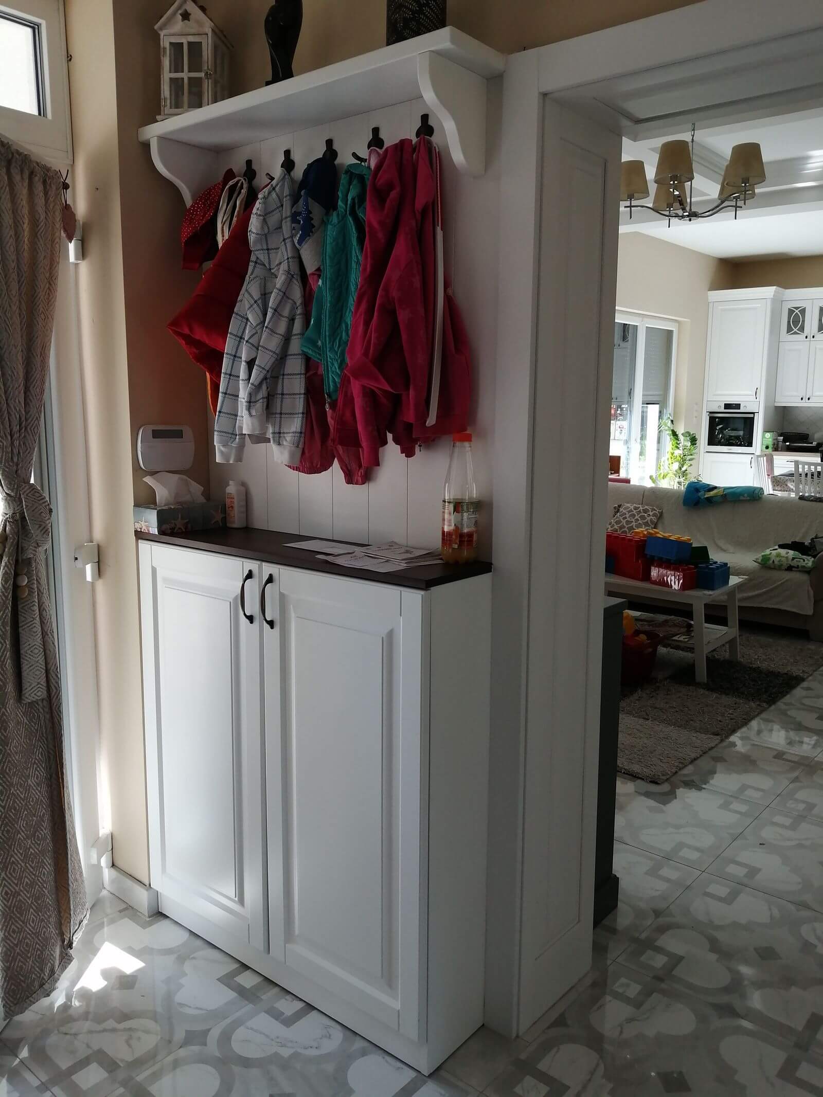 előszoba kiegészítéssel. Az egy légtérben található előszoba, nappali, konyha