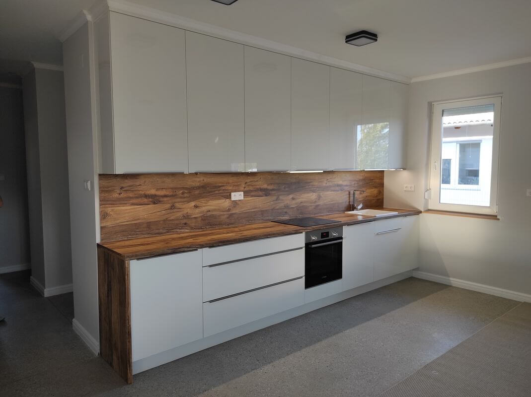 Siófokra készítettük ezt a Fehér modern konyhabútort tölgy kiegészítőkkel