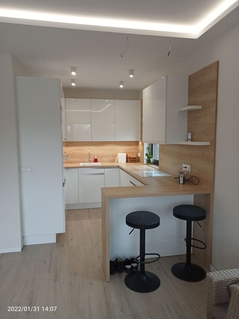 Konyhabútor siófoki nyaralóba fényes fehér és tölgy kombinációban
